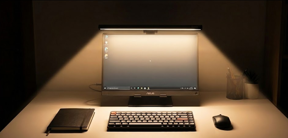 このモデルの隠れた名機能が、背面を照らす「間接照明モード(バックライト)」です。 上部のライトをつけると、モニターの裏側(壁や空間)をほのかに照らしてくれます。